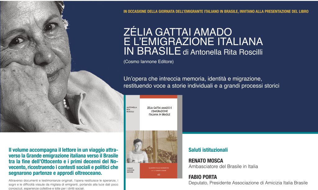 Por ocasião do Dia do Emigrante Italiano no Brasil, promovido pelo Instituto Guimarães Rosa Roma, pela Embaixada do Brasil na Itália e pela Associação de Amizade Itália-Brasil, realizar-se-á na quinta-feira, 19 de fevereiro de 2026, às 17h00, na sede do Instituto Guimarães Rosa (Piazza Navona 18), a apresentação do livro Zélia Gattai Amado e a […]