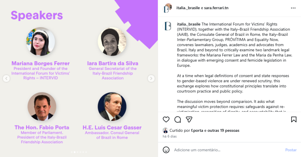 O Deputado Fabio Porta participou do webinar internacional do Fórum INTERVID, organizado pela Associação de Amizade Itália-Brasil, dedicado à comparação entre a Lei Mariana Ferrer e a Lei Maria da Penha e a nova legislação italiana sobre o consentimento e sobre o feminicídio. Em sua intervenção, destacou como a proteção efetiva das vítimas, em particular […]