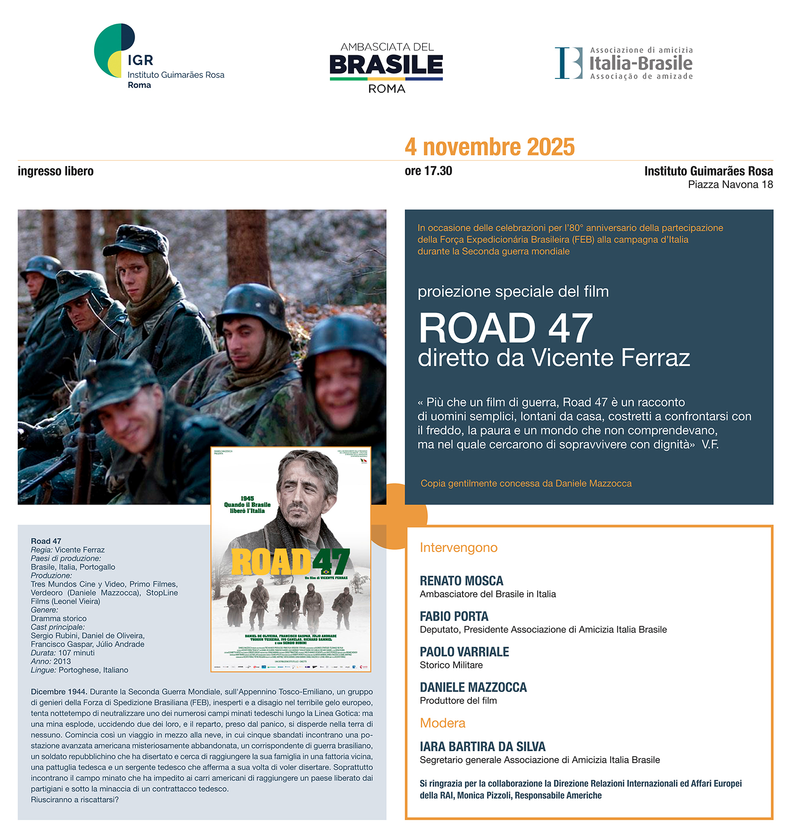 Por ocasião do 80º aniversário da participação da Força Expedicionária Brasileira (FEB) na campanha da Itália durante a Segunda Guerra Mundial, tenho o prazer de anunciar a exibição especial do filme Road 47, de Vicente Ferraz, organizada pela Embaixada do Brasil em Roma e pelo Instituto Guimarães Rosa, em colaboração com a Associação de Amizade Itália–Brasil.