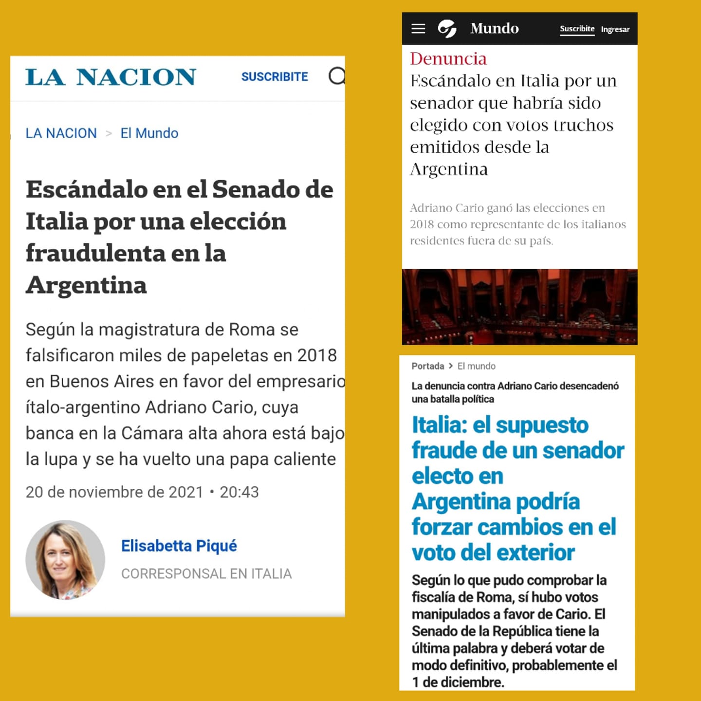Os principais jornais argentinos, LA NACION, CLARIN e PÁGINA12 dão grande destaque ao ′′ escândalo ′′ e às ′′ fraudes ′′ das últimas eleições. Temos o dever de devolver aos italianos da Argentina e do mundo a dignidade manchada por este episódio e garantir a total legalidade do voto dos italianos no exterior