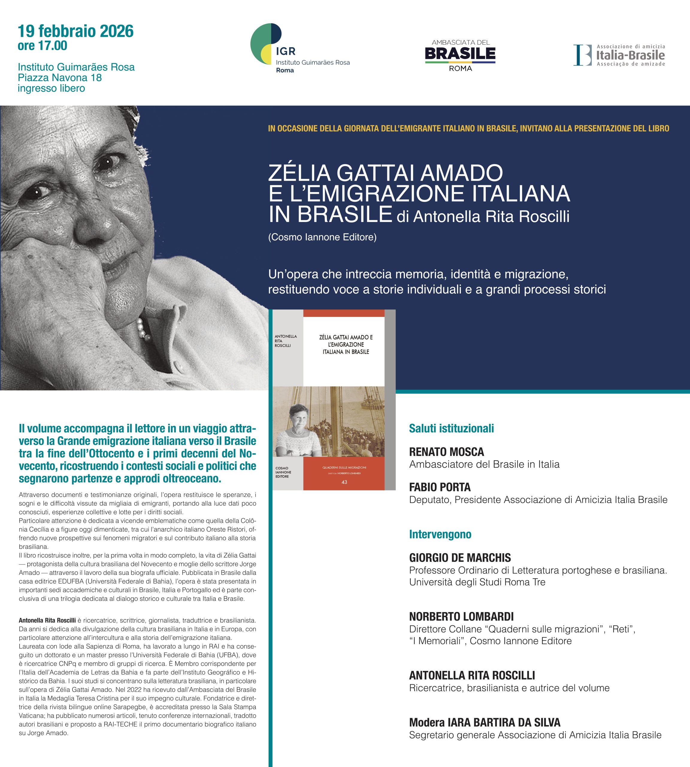 Por ocasião do Dia do Emigrante Italiano no Brasil, promovido pelo Instituto Guimarães Rosa Roma, pela Embaixada do Brasil na Itália e pela Associação de Amizade Itália-Brasil, realizar-se-á na quinta-feira, 19 de fevereiro de 2026, às 17h00, na sede do Instituto Guimarães Rosa (Piazza Navona 18), a apresentação do livro Zélia Gattai Amado e a emigração italiana no Brasil, de Antonella Rita Roscilli (Cosmo Iannone Editore).